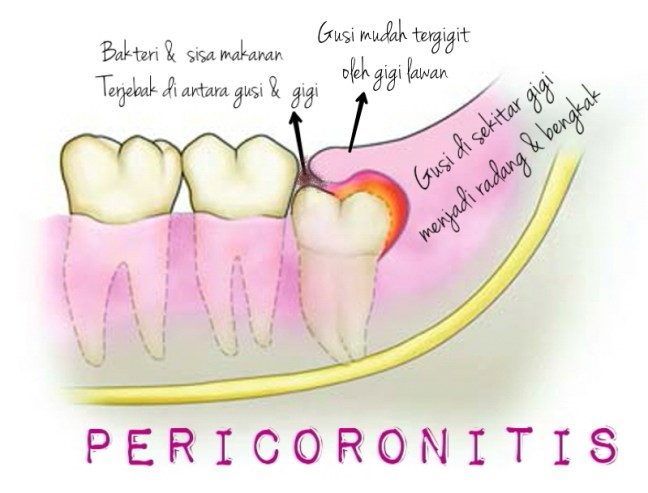 Radang di sekitar mahkota gigi yang sedang tumbuh ini dinamakan pericoronitis.