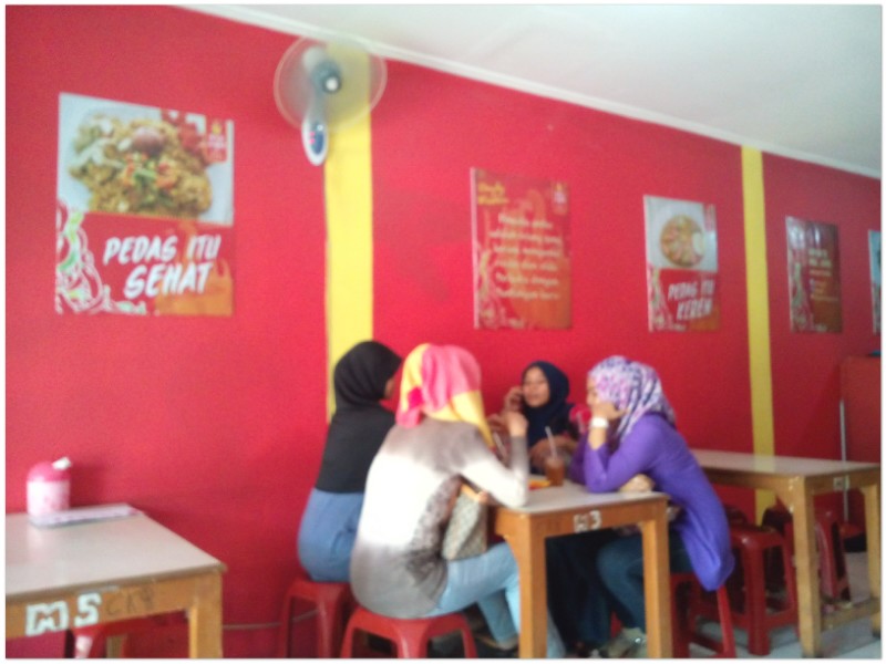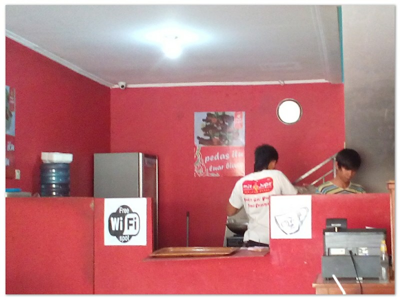 Abis itu lihat suasana rumah makannya… Didominasi oleh warna merah dan kuning. Yang menarik adalah poster-poster pedasnya itu. Dari tempat makan bisa ngintip dapurnya.
