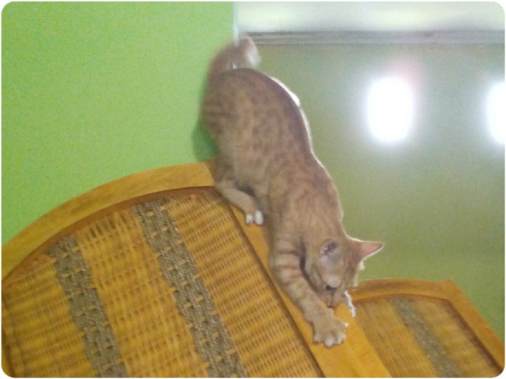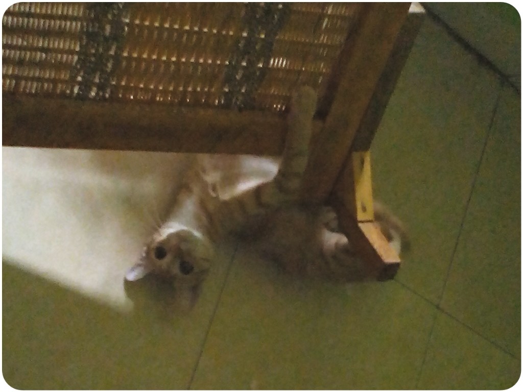 Tadi udah diceritain di awal kan kalau Silly itu suka ngikutin saya ke mana-mana. Kemarin itu Silly agak aneh, dia ngumpet mulu, dan bikin bingung nyarinya (soalnya saya takut dia kabur seperti Happy). Awalnya saya temuin dia dibalik kursi dapur setelah ditemuin dia langsung lari dan ngumpet di balik meja yang bertaplak (keren juga nyari tempat ngumpetnya), setelah lihat polanya saya tangkep si Silly mau main petak umpet lalu saya ambil HP dan permainan dimulai. 😀