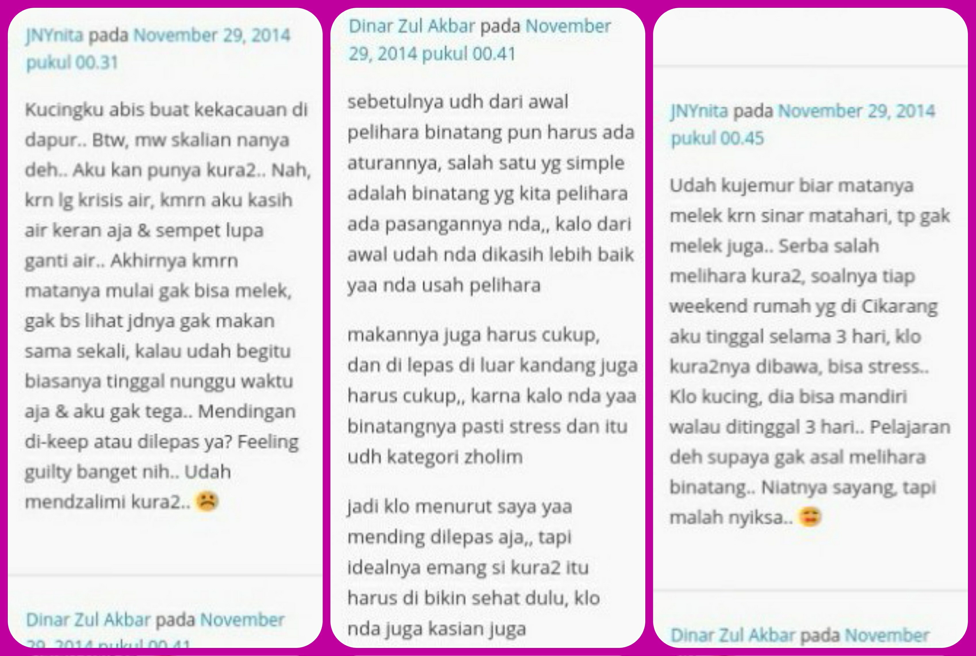 Memelihara hewan kelihatannya sangat sepele ya? Tapi di akhirat kelak hal sebiji atom pun akan dipertimbangkan. Semoga Allah mengampuni kekhilafan saya selama ini. Amiin..