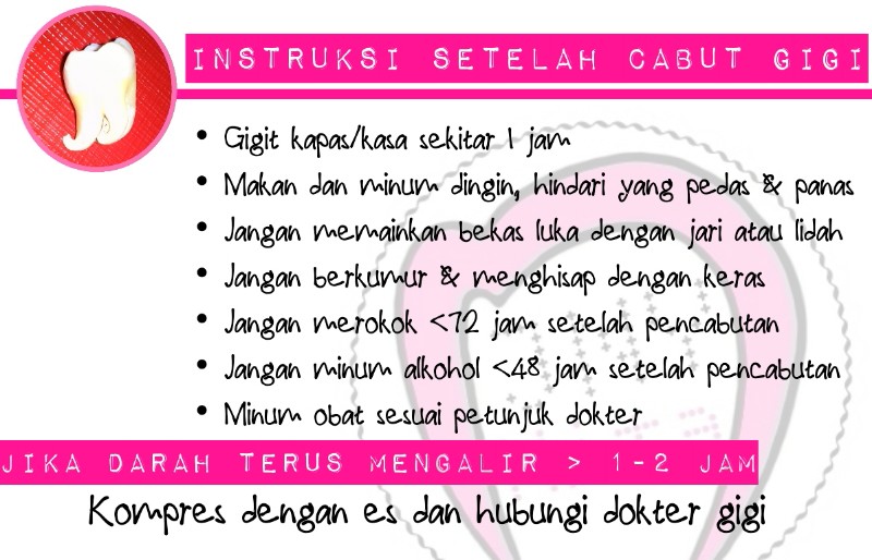 Instruksi ini dibuat supaya darah bekas pencabutan gigi bisa cepat berhenti sehingga bisa makan dan minum dengan nyaman lagi. Normalnya darah setelah pencabutan akan berhenti setelah 1-2 jam, jika lebih dari 2 jam darah masih mengalir terus bisa dilakukan kompres dengan es dan segera periksa ke dokter gigi.