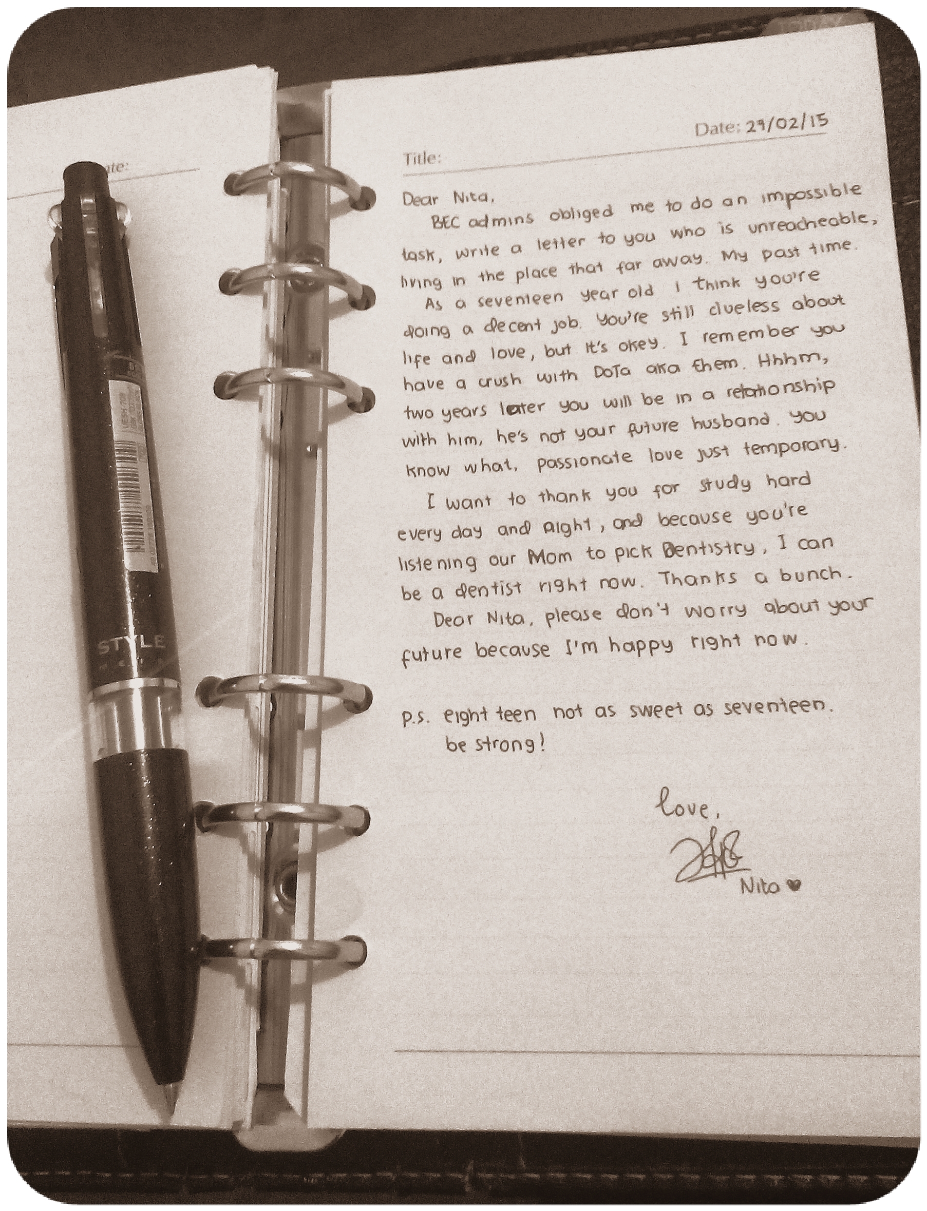 EF#8: Dear Nita Posted on February 27, 2015March 27, 2015 by Nita EF#8 Write a letter to the younger you – 10 years ago Share this: Click to share on X (Opens in new window) X Click to share on Facebook (Opens in new window) Facebook Click to share on Pocket (Opens in new window) Pocket Like Loading... Related