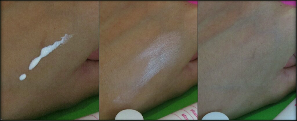 Warna krim-nya putih susu dan konsistensinya pertengahan antara cair dan kental, mudah dibaurkan dan nyaman di kulit (ada rasa sejuk, tapi bukan mint). Sayangnya tampilan di kulit agak white cast, lumayan menguntungkan untuk bantu menyamarkan noda hitam tapi pas difoto pakai flash jadi kurang cakep.