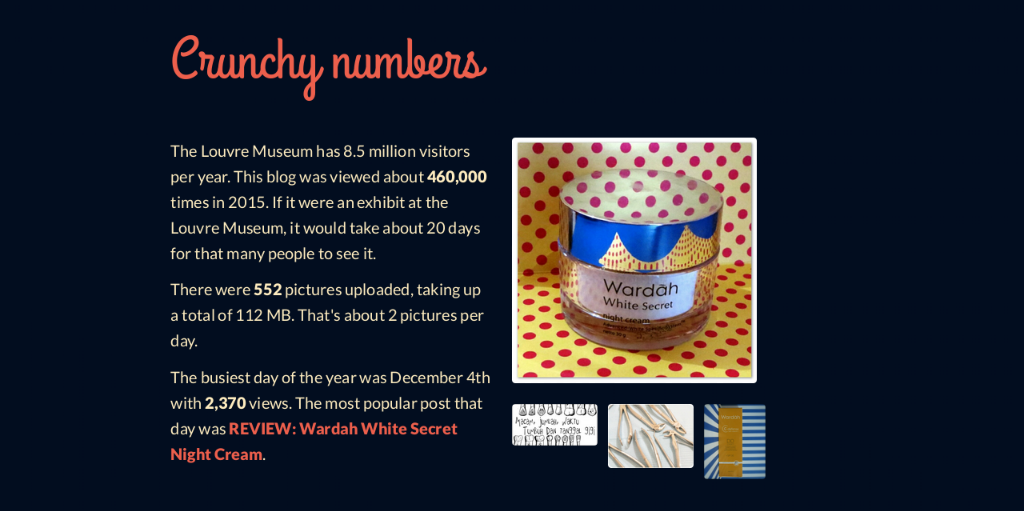 Kunjungan blog ini dalam setahun sekitar 460.000 jauh lebih banyak dari yang kubayangkan. Tadinya kunjungan to 20.000 perbulan saja sudah berasa berat banget mencapainya, ternyata Alhamdulillah bisa mencapai 2 kali lipatnya lebih. Post yang paling banyak kunjungannya adalah tentang Wardah White Secret Night Cream.