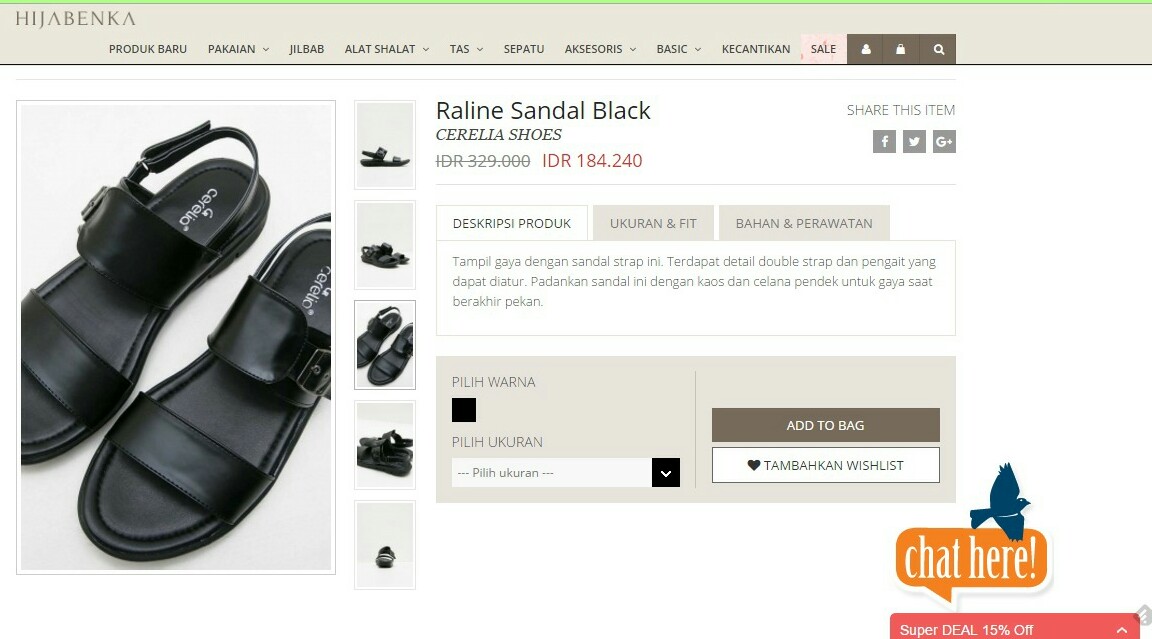 Awalnya aku mau beli sepatu yang modelnya cewek banget, tapi dipikir-pikir, aku kan lebarannya di Kampung kalau pakai sepatu cantik bisa bikin ribet diri sendiri. Dari hasil mantengin web-nya Hijabenka akhirnya aku tertarik dengan sendal Raline Sandal Black karena modelnya sederhana, kelihatan bikin nyaman, dan diskonnya lumayan banget dari Rp. 329.000 menjadi 184.240.