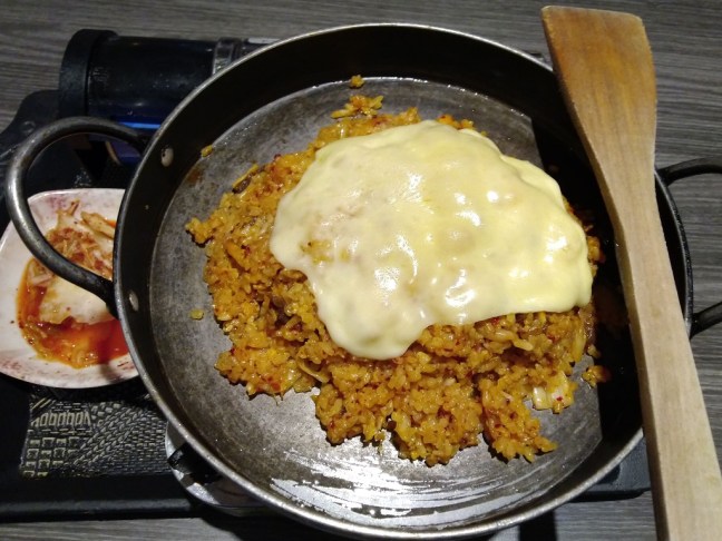 Makanan yang kupesan kemarin adalah cheese kimchi bokumbap alias nasi goreng kimchi pakai keju. Rasanya gimana? Biasa sajaaaa yang penting teh hijau melatinya enak dan menyegarkaaan! 😀