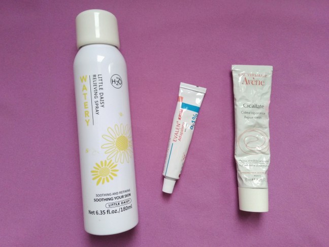 Untuk malam hari setelah double cleansing pakai cleansing oil dan facial wash, aku semprotkan Miniso Little Daisy Relieving Spray untuk hidrasi. Lalu pakai Evalen Krim untuk mengeluarkan sumbatan-sumbatan. Dan supaya ngasih kelembapan dan gak iritasi aku pakai Avene Cicalfate Repair Cream (katanya ini bentuk barunya Avene Recovery Cream).