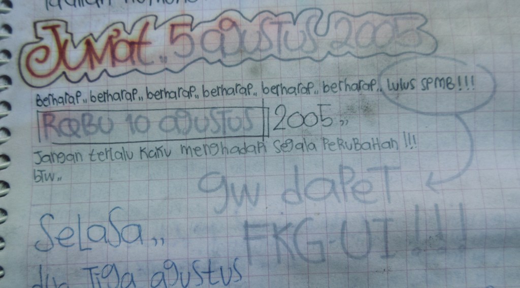 Menjadi lebih fokus. Aku menuliskan goal-ku di diary dan juga menuliskan agendaku di sana. Setiap hari rutin dibuka dan dibaca ulang, akhirnya tertanam di pikiran. Di buku diary-ku tahun 2005 isinya mayoritas tentang persiapan Ujian Nasional dan SPMB, jadwal belajar, hasil try-out, dan sebagainya. Alhamdulillah di hari Jumat, 5 Agustus 2005 aku bisa dapat hasil yang kuinginkan, masuk FKG UI.