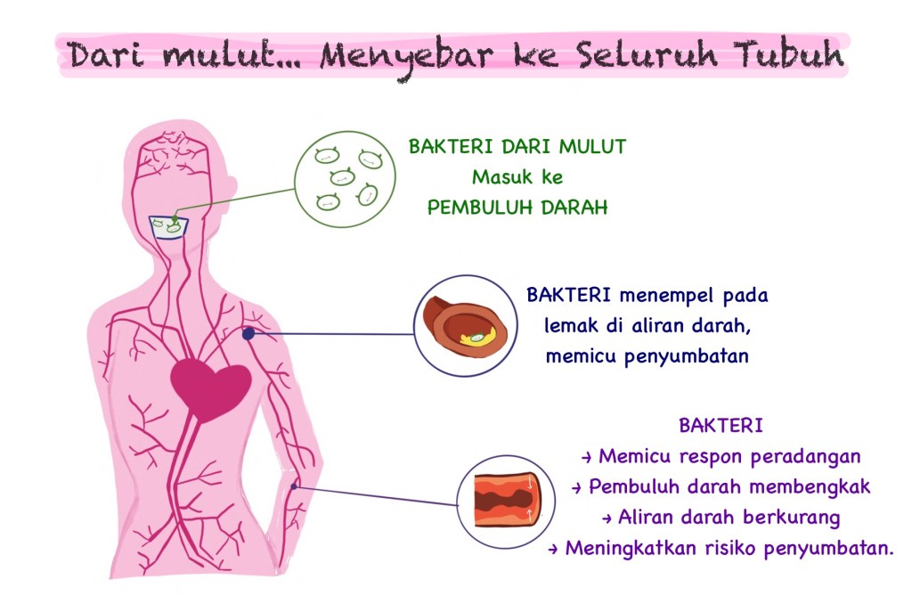 Dari GIGI dan GUSI, bakteri menyebar ke SELURUH TUBUH diperantarai oleh pembuluh darah.