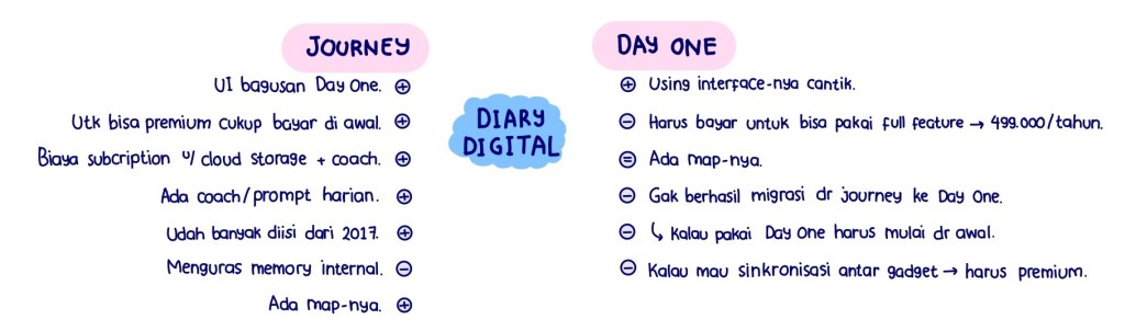 Kalau Day One gak punya kekurangan-kekurangan itu, aku lebih suka Day One karena tampilan per-entry-nya lebih menarik (mirip seperti blog post). Kelebihan-kelebihan Journey lumayan banyak, akhirnya aku memilih untuk konsisten pakai aplikasi Journey aja tapi sedihnya karena dia menguras memory internal (sekitar 5 GB), pas gadget-nya kepenuhan, mau gak mau harus di-uninstall dulu baru di-install ulang pas kapasitas hp-nya udah leluasa lagi.