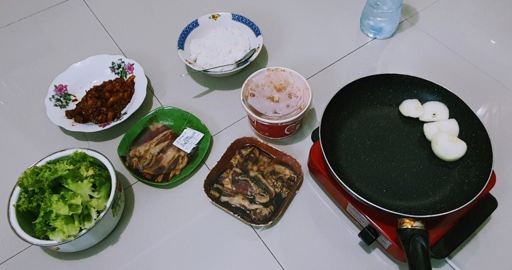 Berhubung kemarin (pas masih di Bekasi) sempet gak bisa leluasa makan di luar lama-lama, akhirnya juga DIY bikin lapak di rumah. Modalnya kompor listrik dan teflon aja, dagingnya beli yang sudah di-slice, bumbunya pakai Kikkoman yang bulgogi dicampur yang teriyaki bawang plus bawang bombay.