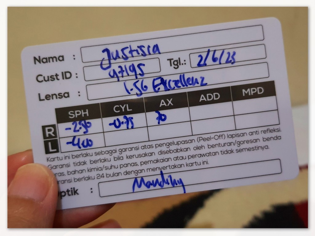 Sayang opsi lensanya dengan minusku terbatas, hanya lensa yang harganya 300 ribu dan 320 ribu. Aku pilih yang lebih murah, karena yang 320.000 lebih mendistorsi warna sedangkan aku butuh warna yang mirip dengan kenyataan (biar gak bikin masalah kalau harus mencocokkan warna gigi).